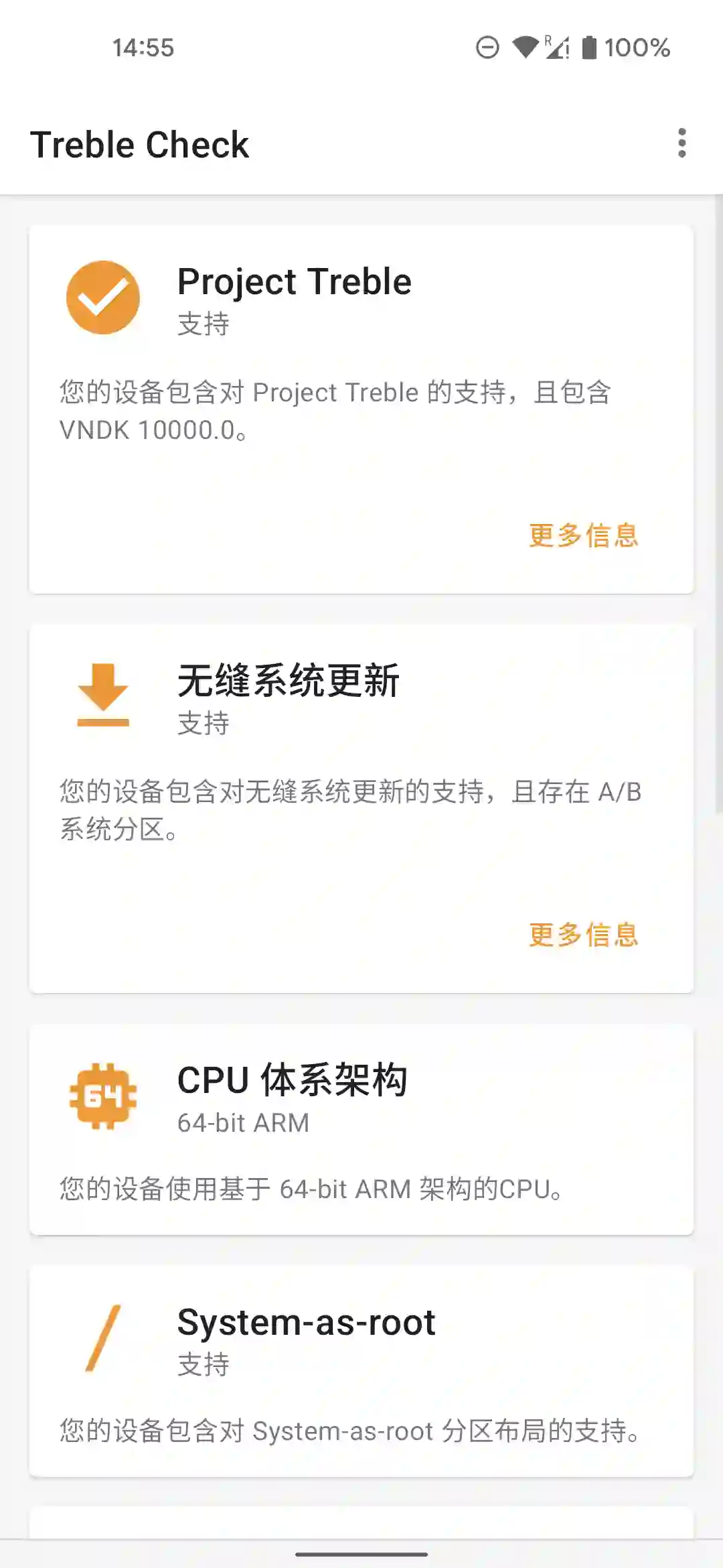 如果你不确定自己的设备是否支持动态分区特性,建议先下载安装 Treble Check 这个应用打开看看。