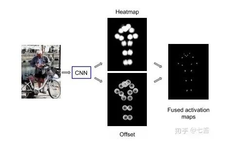第一阶段使用faster rcnn做detection,检测出图片中的多个人,并对bounding box进行image crop;第二阶段采用fully convolutional resnet对每一个bonding box中的人物预测dense heatmap和offset; 最后通过heatmap和offset的融合得到关键点的精确定位。