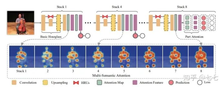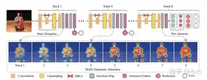 这篇文章整合多内容信息注意力机制(multi-context attention mechanism)到CNN网络,得到人体姿态估计 end-to-end 框架.采用堆积沙漏网络(stacked hourglass networks) 生成不同分辨率特征的注意力图(attention maps),不同分辨率特征对应着不同的语义.并同时结合了整体注意力模型和肢体部分注意力模型,整体注意力模型针对的是整体人体的全局一致性,部分注意力模型针对不同身体部分的详细描述. 因此,能够处理从局部显著区域到全局语义空间的不同粒度内容.另外,设计了新颖的沙漏残差单元(Hourglass Residual Units, HRUs),增加网络的接受野. HRUs 扩展了带分支的残差单元,分支的 filters 具有较大接受野;利用 HRUs 可以学习得到不同尺度的特征.
