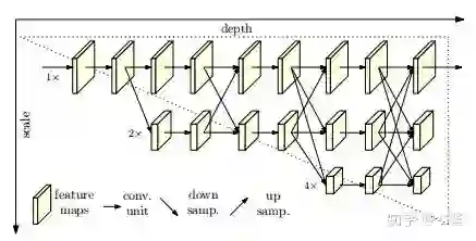 HRNet的体系结构。它由并行的高到低分辨率子网组成,并在多分辨率子网之间进行重复的信息交换(多尺度融合)。即模型是通过在高分辨率特征图主网络中逐渐并行的加入低分辨率特征图子网络,不同网络实现多尺度融合与特征提取实现的。