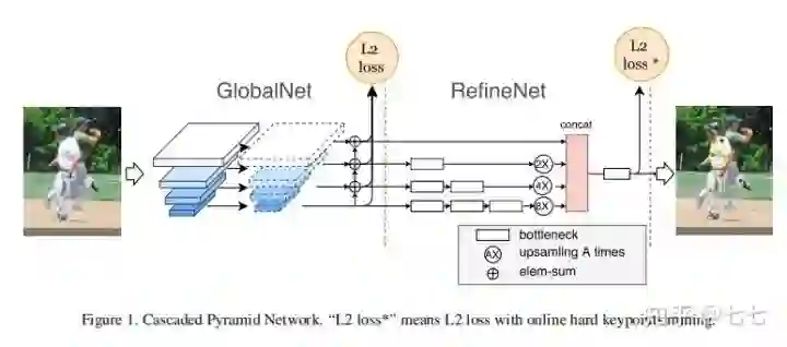 这篇文章是由Face++团队发表的COCO 17关键点的冠军方案,本论文主要关注的是不同类别关键点的检测难度是不一样的,整个结构的思路是先检测比较简单的关键点、然后检测较难的关键点、最后检测更难的或不可见的关键点。分为两个stage,GlobalNet和RefineNet其中GlobalNet主要负责检测容易检测和较难检测的关键点,对于较难关键点的检测,主要体现在网络的较深层,通过进一步更高层的语义信息来解决较难检测的关键点问题;RefineNet主要解决更难或者不可见关键点的检测,这里对关键点进行难易程度进行界定主要体现在关键点的训练损失上,使用了常见的Hard Negative Mining策略,在训练时取损失较大的top-K个关键点计算损失,然后进行梯度更新,不考虑损失较小的关键点。