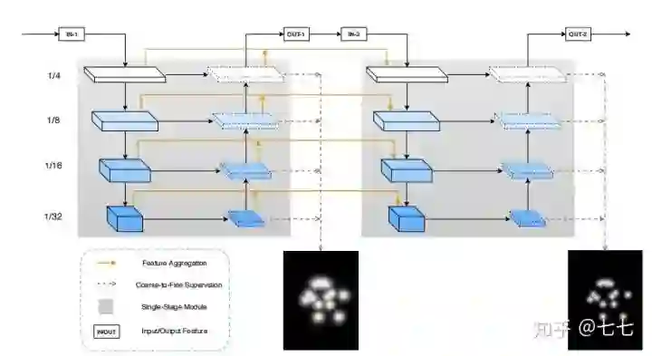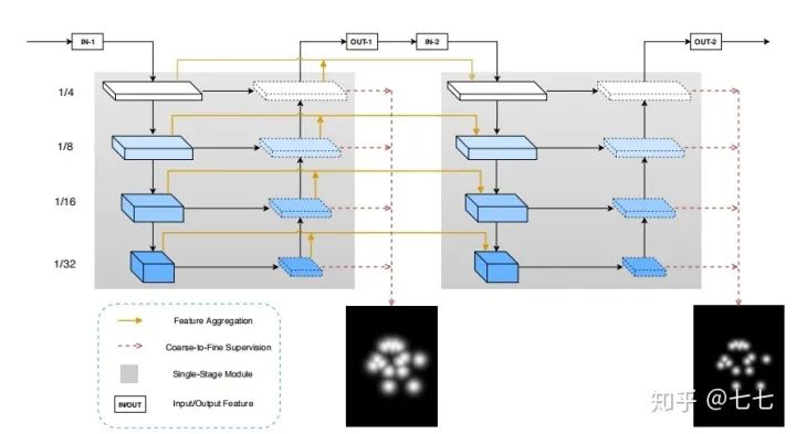 时隔一年,Face++团队又拿下了COCO 18关键点检测冠军。提出了多阶段姿态估计网络(MSPN)有三个新的技术。首先,当前多阶段方法中的单级模块远非最优。例如,沙漏在所有块中使用相等宽度的通道用于向下和向下提取。这种设计与当前网络架构设计(ResNet)不一致。作者发现采用现有良好的网络结构进行下采样路径和简单的上采样路径要好很多。其次,由于重复的向下和向上采样步骤,信息更容易丢失,优化变得更加困难。作者建议在不同阶段汇总特征以加强信息流动并减轻培训的难度。最后,观察姿势定位精度逐渐提高。在多阶段,作者采取粗到细的多监督方式。