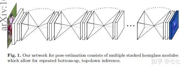 在Hourglass模块中,卷积和max pooling被用来将特征降到一个很低的分辨率,在每一个max pooling步骤中,网络产生分支并在原来提前池化的分辨率下使用更多的卷积,当到达最低的分辨率的时候,网络开始upsample并结合不同尺度下的特征。这里upsample(上采样)采用的方法是最邻近插值,之后再将两个特征集按元素位置相加。当到达输出分辨率的时候,再接两个1×1的卷积层来进行最后的预测,网络的输出是一组heatmap,对于给定的heatmap,网络预测在每个像素处存在关节的概率。