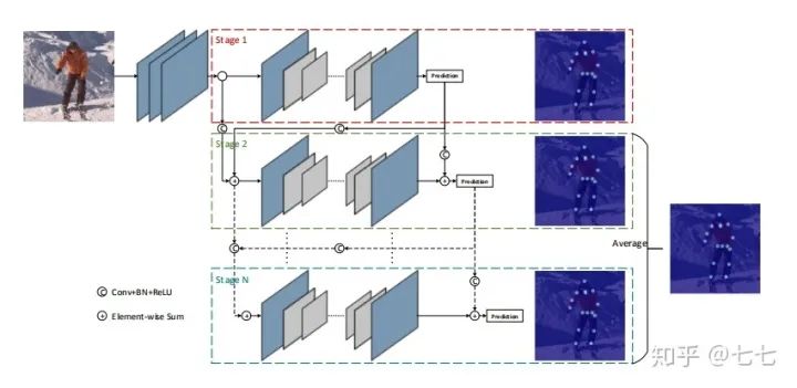 这篇文章是2019年mpll数据集结果达到93.3%那篇,相比其他论文,这篇文章达到这么高的评分,主要有三点,一是,作者把stage2到stageN的heatmap的平均值作为最后输出;二是作者通过实验得出stage1把resnet101作为backbone,后面的stage采用resnet50作为backbone效果最佳;三是作者引入了AI Challenger的数据集来扩充训练数据。
