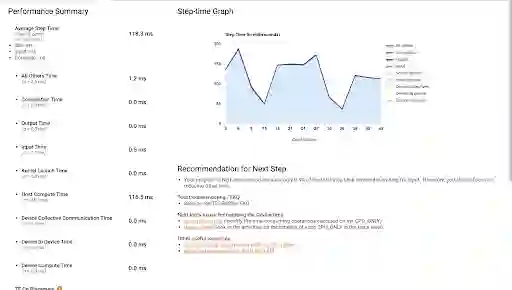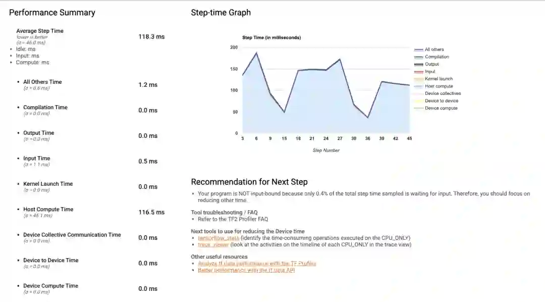当您第一次打开性能剖析器时,显示的数据均来自程序化模式。您可通过概览页面了解到每个训练步骤所需时长。无论是扩缩基础架构(向集群中添加更多的虚拟机、使用配备更多 CPU 和更大内存的虚拟机、与硬件加速器集成)还是提高代码效率,当您尝试用不同的方法来提升训练性能时,均可以此为参考。