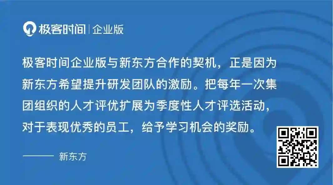 极客时间企业版与新东方合作的契机,正是因为新东方希望提升研发团队的激励。把每年一次集团组织的人才评优扩展为季度性人才评选活动,对于表现优秀的员工,给予学习机会的奖励。