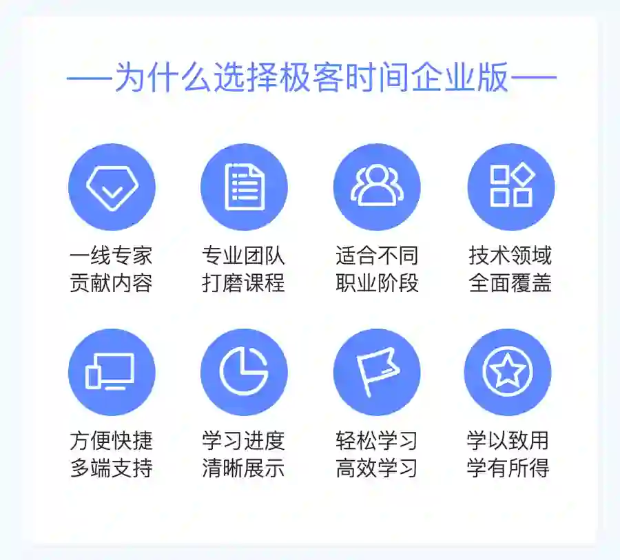 极客时间企业版是极客邦科技基于极客时间打造的企业级研发团队学习服务和协作平台,为不同岗位不同角色的工程师提供知识产品和学习服务,通过学习、讨论、练习和作业等体系化学习方式,提升研发团队的综合能力,为企业赋能。