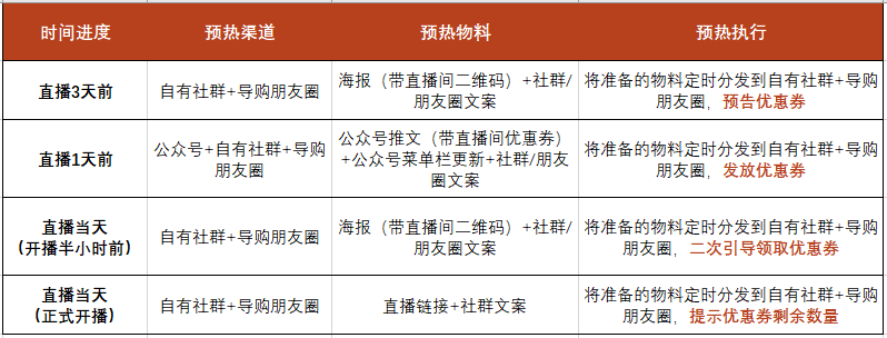 直播预热的节奏感,从根本上说,就是降低潜在消费者厌烦情绪的同时,持续增强甚至占领消费者对本次直播活动的认知。所以有经验的商家,一般在直播前会采取4波预热行动: