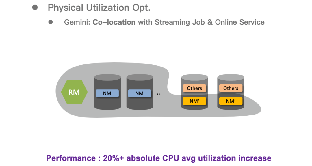 我们通过将 NodeManager 改造为可以根据宿主机的富余资源动态的调整的 NM',来达到与流式作业和在线服务的混部,为离线提供更多资源的目的。