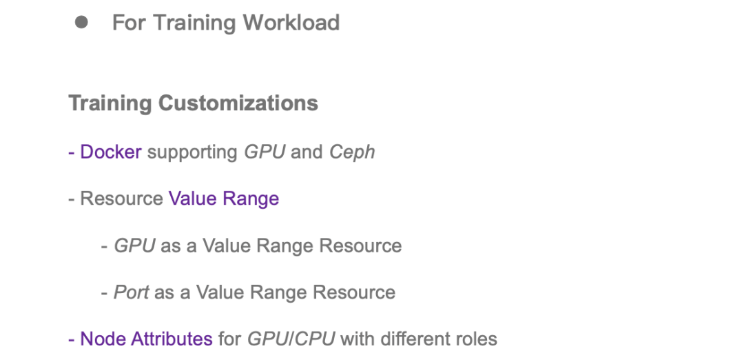 为了更灵活的资源申请,定制了带范围的资源值:传统的 YARN 资源只有个数, 没有范围,比如多少个 CPU,多少 GB 内存,但在训练场景下,有时希望有范围,比如当需要两个 GPU 卡时,不止希望随意的两张卡,而是希望要一台机器上两个连号的 GPU 卡,比如卡 0 和卡 1 是连号的,而卡 0 和卡 2 不是连号的。这个场景同样也适用于端口号。