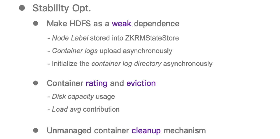 稳定性提升:包括摆脱对 HDFS 强依赖, Container 分级与驱逐, 非受控 Container 管理。