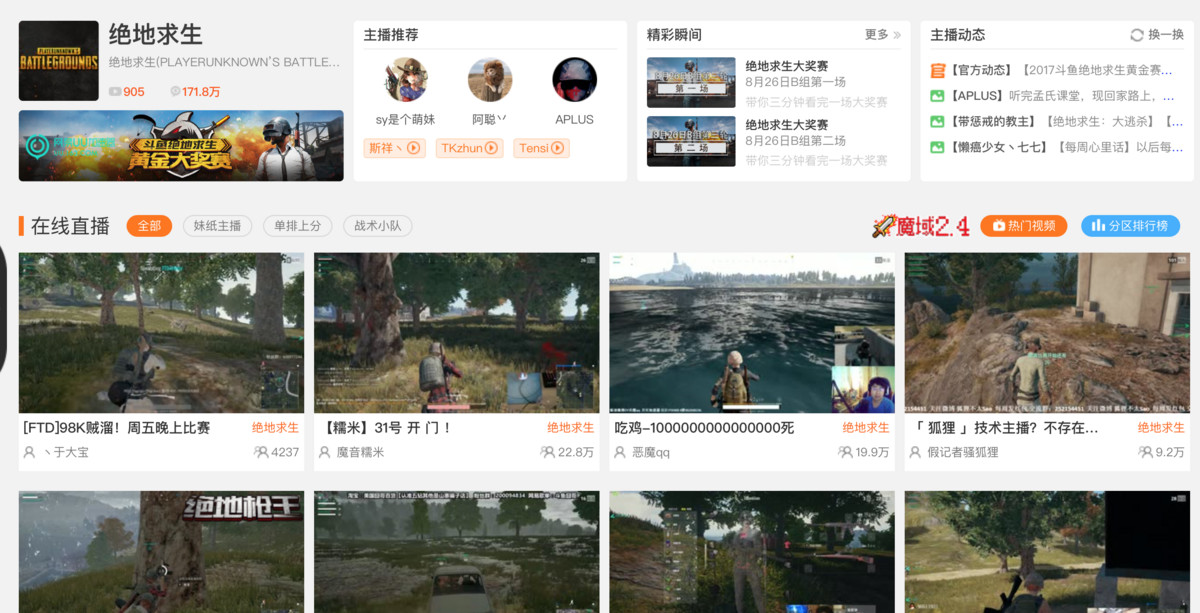 而在中文互联网上,吃鸡浪潮的火热程度不亚于同期起来的嘻哈,打开任何的一家游戏直播平台的主页,除了LOL 和王者荣耀,最火的就是绝地求生,在用户数只有 LOL 和王者荣耀几分之一甚至几十分之一的情况下达成这样的成就,可谓火到发烫。