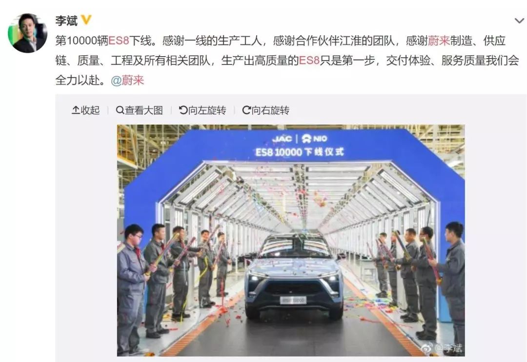 蔚来汽车昨日在合肥工厂下线第 1 万辆 ES8,这意味着蔚来创始人李斌之前与小鹏汽车董事长兼 CEO 何小鹏约定「今年交付 1 万台」的赌局赢了。对此,何小鹏在朋友圈发文称:「的确超出预期,祝贺,加油,期待明年 1 月份看到的上险数量超出目标。」