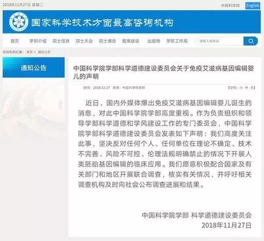 科技部副部长徐南平昨日下午表示,2003 年颁布的《人胚胎干细胞研究伦理指导原则》规定,可以以研究为目的,对人体胚胎实施基因编辑和修饰,但体外培养期限自受精或者核移植开始不得超过 14 天,而本次「基因编辑婴儿」如果确认已出生,属于被明令禁止的,将按照中国有关法律和条例进行处理。中国科学院学部科学道德建设委员会昨日晚间就「基因编辑婴儿」消息发表声明称,坚决反对任何个人、任何单位在理论不确定、技术不完善、风险不可控、伦理法规明确禁止的情况下开展人类胚胎基因编辑的临床应用。