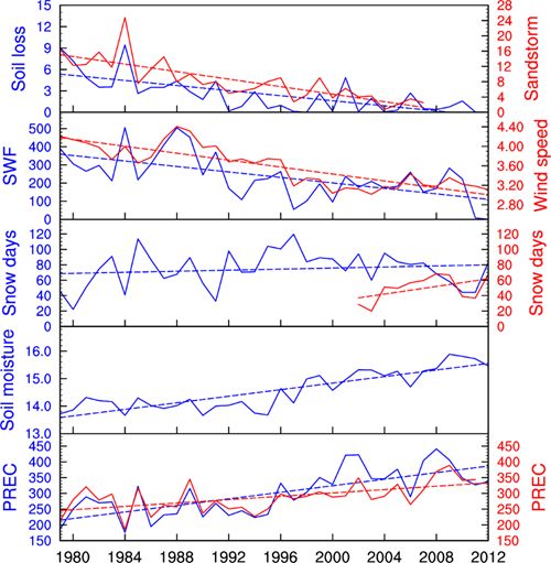 耦合模式模拟的土壤损失量、积雪日数、土壤湿度及来自驱动数据的年累积降水(PREC)、大风次数(SWF)年变化趋势(蓝线)与观测的沙尘暴发生次数、平均风速、积雪天数和降水的变化趋势(红线)