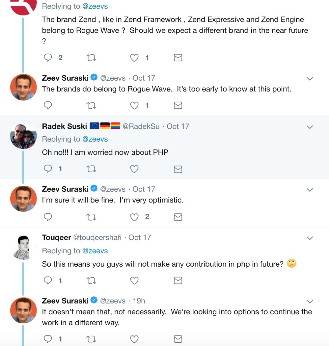 2018年10月17日,Zeev Suraski 在其个人博客上表示,非常感激 Rogue Wave 在过去的三年里一直庇护着他和团队进行 Zend Engine 的相关开发工作。不过,Rogue Wave 最近做出了一项战略决策,将其后续工作重点放在 Zend Server 部分。因此,Zeev Suraski 和他的团队 - 包括 Dmitry Stogov、Matthew Weier O'Phinney 和 Enrico Zimuel 决定将离开公司并寻找新的机会。