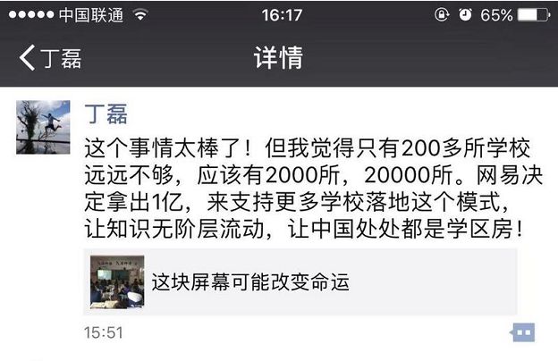 而网易丁磊下午也在朋友圈分享了这篇文章,并表示,“这个事情太棒了!但我觉得现在只有200多所学校远远不够,应该有2000所,20000所。网易决定拿出1亿,来支持更多学校落地这个模式,让知识无阶层流动,让中国处处都是学区房!”