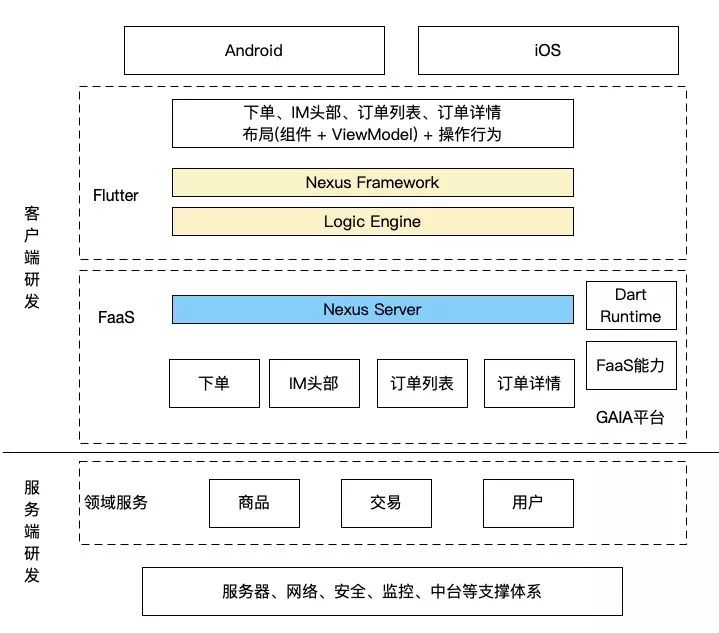 目前公司 FaaS 环境已经支持 Java、Kotlin、Swift、Dart、Node.js 等多种语言与框架,闲鱼通过 Android(Flutter)、iOS(Flutter)、FaaS(Dart Runtime)都使用Dart 达到语言一体,并且实现协议一体与工程一体。