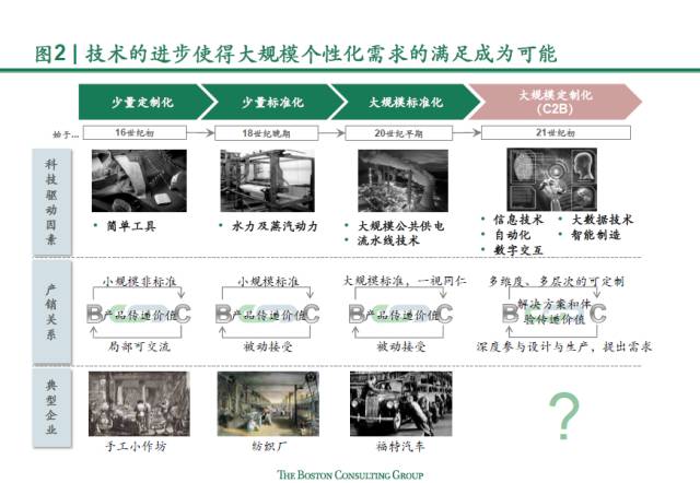 站在今天的视角,其实很难给C2B模式下一个精确的定义,这是一个不断渐进迭代的过程。我们所确定的是,C2B绝不仅仅局限于产品的定制化以及其实现的种种技术手段,其更多的是理念和模式上的突破,是“以用户需求为中心”的核心商业准则在新技术时代的延续。它并不仅是接受客户主动表达的需求,也需利用大数据等先进技术手段深度挖掘客户潜意识需求。从覆盖范围上讲不应仅仅停留在产品层面,也需要注重打造服务,让客户参与过程体验,使得用户和企业间的关系变得更紧密、更有温度。