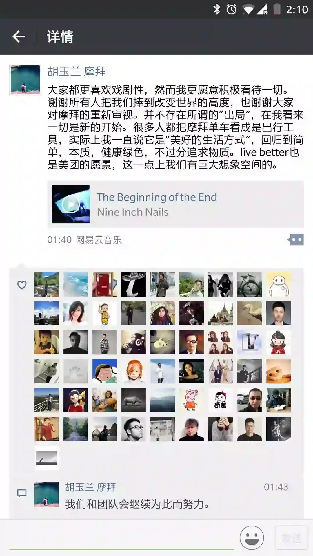 随后摩拜单车创始人胡玮炜深夜发声证实美团收购摩拜,称并不存在所谓的“出局”,在我看来一切是新的开始。美团创始人、CEO王兴也发文表示,摩拜将和美团一起开创更辉煌的未来。