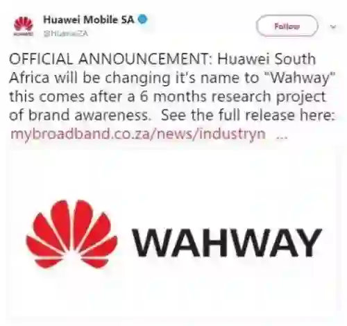 4月1日愚人节,有外媒报道,为了方便消费者发音,华为公司名称的拼写“HUAWEI”将更改为“Wahway”。本来以为这就是一个愚人节的玩笑,没想到华为南非官方推特账号确定了这个消息!