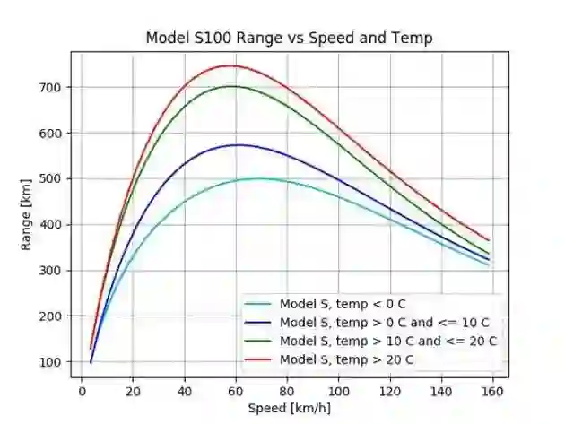 一份 ABRP(海外电动汽车行程规划工具)统计的 511 辆特斯拉 Model S100 日常使用数据显示,车速在 50-60 km/h 时的电动机效率最佳,超过该区间后效率明显下降。在对电池相对友好的 10℃以上的环境内,Model S100 的 120km/h 匀速续航里程,甚至还不到 50-60 km/h 的三分之二。