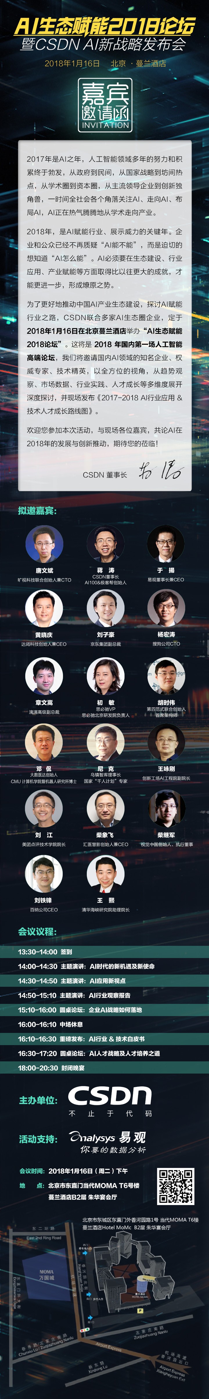 2018年1月16日“AI生态赋能2018论坛暨CSDN AI新战略发布会”即将重磅开启!