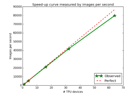 随着所使用的TPU设备数量的增加,在ImageNet上进行ResNet-50训练的实验显示其接近完美的线性加速。