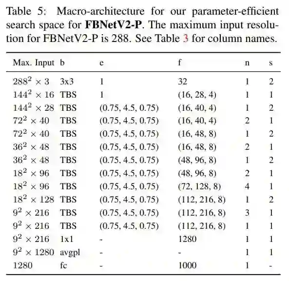 输入为288x288x3。channel 维度的搜索体现在表格种的 number of filters f,比如说可能是 16 到 28 之间步长为 4 的一个值。spatial 维度的搜索体现在表格中的block expansion rate e,从 0.75 到 4.5,步长为 0.75。