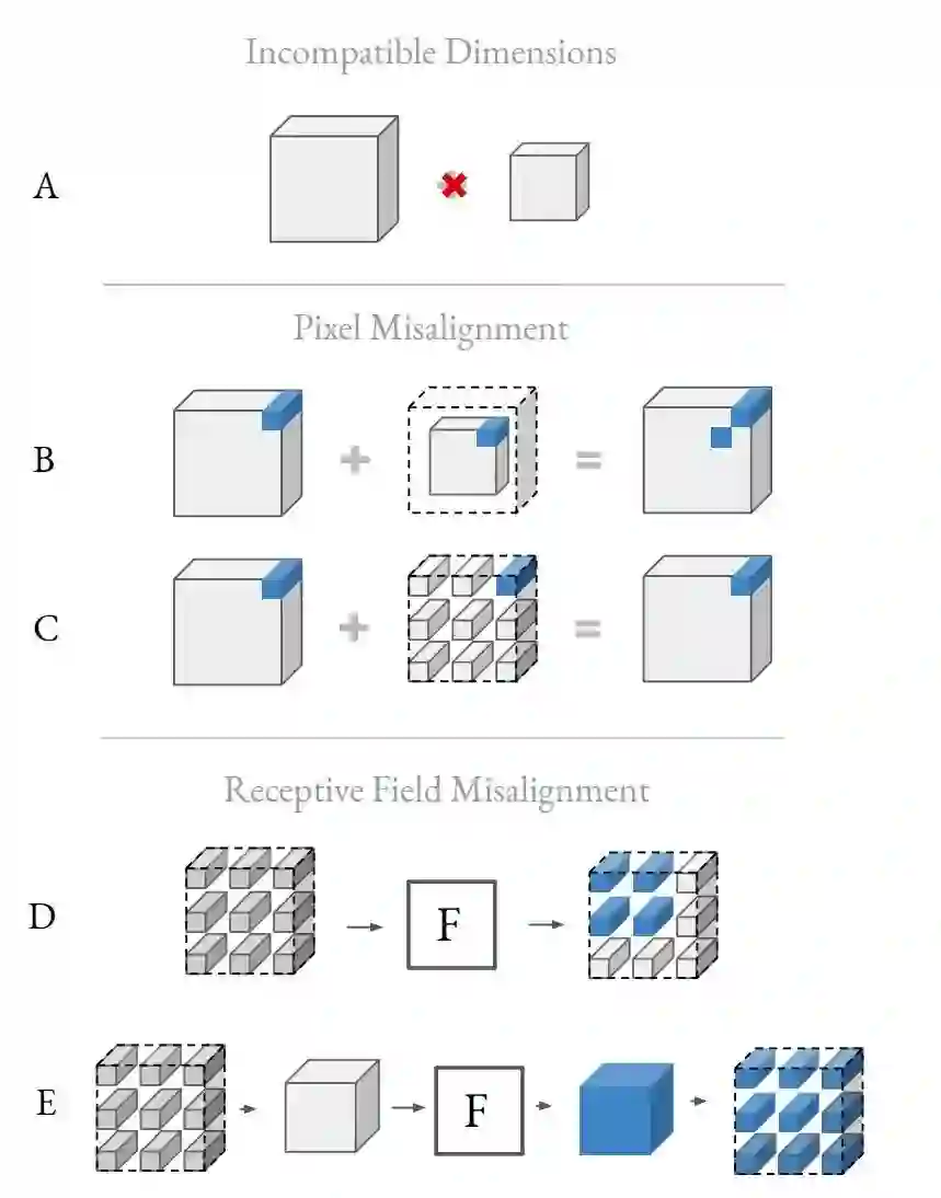 上面说了在 channel 维度的做法。在 Spatial 维度的做法也是类似的,作者也想构造一种加权和的形式表征不同分辨率的 feature。如上图 A 所示,不同分辨率的 tensor 不能直接相加。图 B 说明了在边缘 padding 的方式不行,pixel 无法对齐。图 C 说明了为了让 pixel 对齐,要采用这种 Interspersing zero-padding 的形式。但是图 C 这种方式会又带来感受野 mis-alignment 的问题:如图 D 所示,Interspersing zero-padding 之后,一个 3x3 的 kenel 有效感受野变成了 2x2。所以图 E 才是作者最终的解决方法:和 F 运算完之后再 padding。