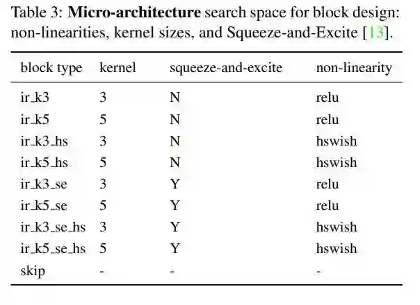 可以看出,组成的 block type 就是由 3x3 或者 5x5 的 depth-wise conv + SE + relu / hswith 组成。
