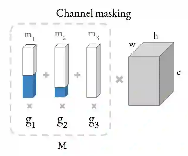 具体的做法如上图所示。右边那个灰色的长方体表示一个 shape 为 (c, h, w) 的 tensor,和左边的 mask 向量 M 相乘的结果。M 可以拆解为多个 mask 和对应的 Gumbel Softmax 的系数