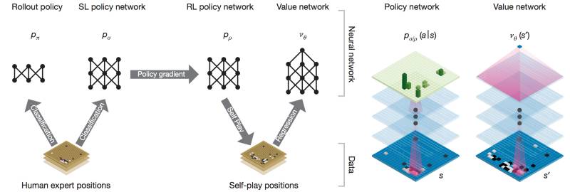 AlphaGo 是由一系列相对来说比较基础(standard)的技术组成的:行为复制(对人类所展示的数据进行有监督式的学习),强化学习,价值函数和蒙特卡洛树搜索(MCTS)。不过,这些“组件”的组合形式是极具创新性的。