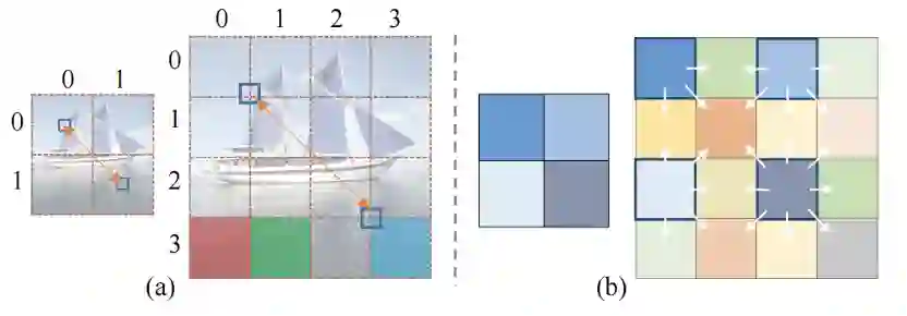 此外,本文针对传统位置编码提出两个重要问题。第一,对于图像生成任务,在计算 PE(位置编码)时,是否应该考虑图像语义? 传统的 PE 是根据按照逻辑排序的句子来设计的,而图像序列是根据图像内容语义来组织的。假设两个图像补丁之间的距离为 d(.,.) 。如图 3(a) 右边部分所示,d((0 , 3 ), (1 , 3 )) (红色和绿色块) 之间的差异与 d(( 0 , 3 ), (3 , 3 )) (红色和青色 块) 之间的差异应该是相似的,因为风格化任务要求相似的内容补丁有相似的风格化结果。第二,当输入图像尺寸呈指数级增大时,传统的正弦位置编码是否仍然适用于视觉任务? 如 3(a) 所示,当图像大小发生变化时,相同语义位置的补丁 (用蓝色小矩形表示) 之间的相对距离会发生显著变化,这不适合视觉任务中的多尺度输入要求。