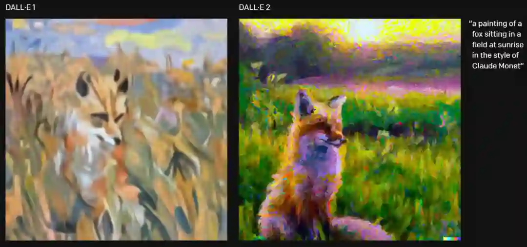 DALL·E 2 比一代模型到底好在哪?简单来说 DALL·E 2 以 4 倍的分辨率生成更逼真、更准确的图像。例如下图生成一幅「日出时坐在田野里的狐狸,生成的图像为莫奈风格。」DALL·E 2 生成的图像更准确。