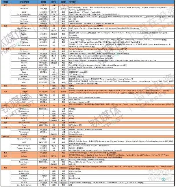 从地域上看,这两周收录的70起投融资事件中,38起发生在美国。印度收录6起,其中物流3起,旅游2起,电商1起。具体国家分布如下:英国5起,以色列4起,新加坡和3起,日本,韩国,印度尼西亚和德国各2起,爱尔兰,法国,加拿大,迪拜,新西兰各1起。