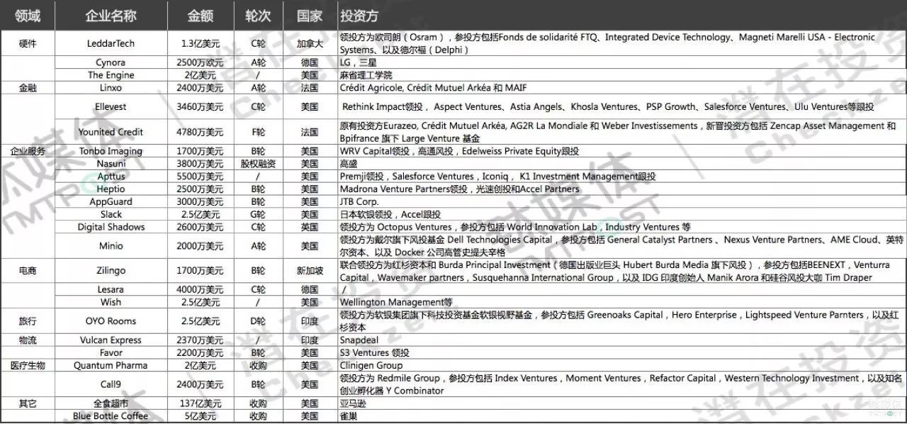 具体领域分布如下:企业服务8起,电商,金融,硬件各3起,物流,医疗生物各2起,旅行1起,其它2起。