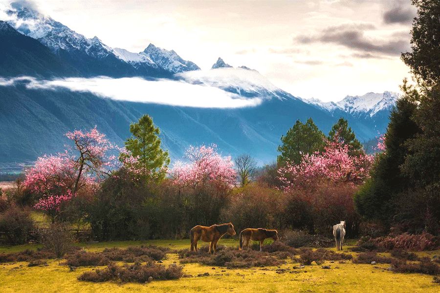当西藏山峰上的雪还未化的时候,林芝宽阔平坦的草原上的百亩桃花已经静静绽放了。