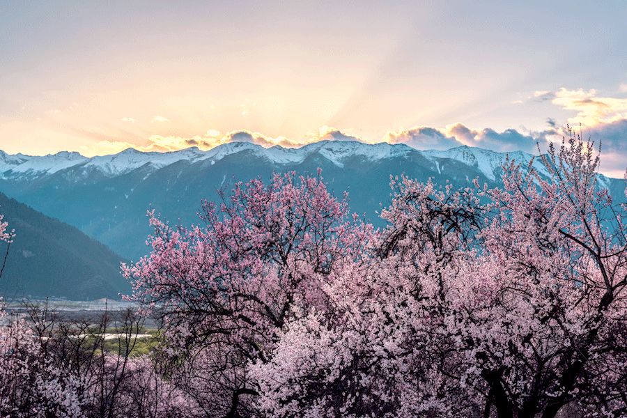 我深信不疑,好像生怕错过了什么似的,等待着与林芝相见。直至某个初春的清晨,隔着初生的太阳,那淡粉色的花瓣努力从卷缩中舒展开来,等到天空稍稍明亮一点,呼啦啦地,满树密密麻麻,漫山密密匝匝,远远望去好似一张绿色地毯上春光乍泄。