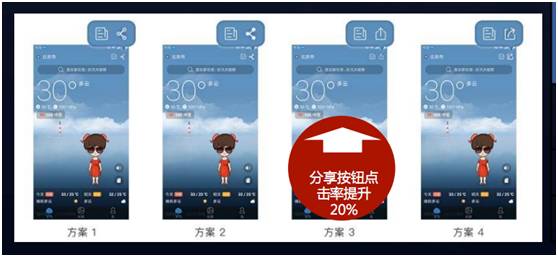 用墨迹天气这个案例来说一下我们做的这个事情的价值,更重要的是让大家明白我们的技术是怎么帮助企业提升商业价值的。比如试着把分享按钮做了几个不同的版本,对比原始版本,看哪个更好。