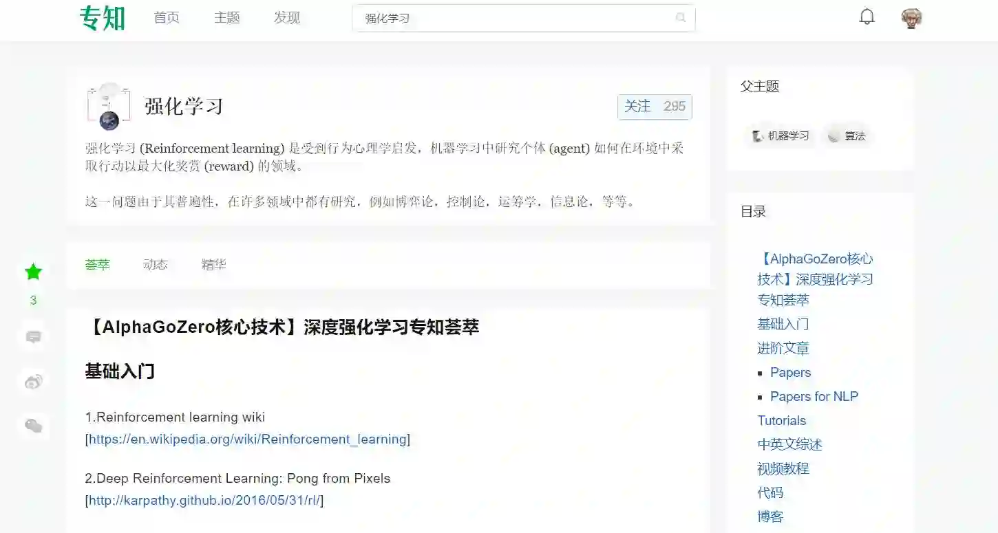 请PC登录www.zhuanzhi.ai或者点击阅读原文,注册登录,顶端搜索“强化学习” 主题,查看评论获得专知荟萃全集知识等资料,直接PC端访问体验更佳!如下图所示~