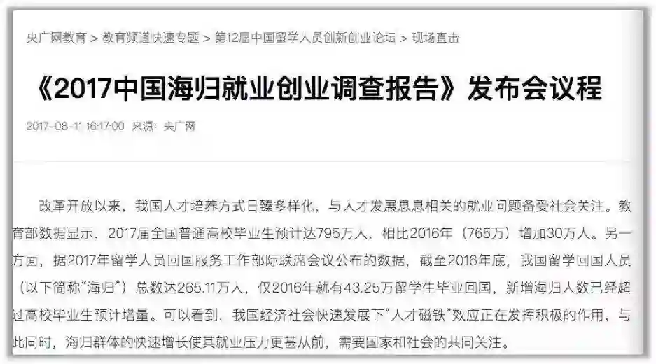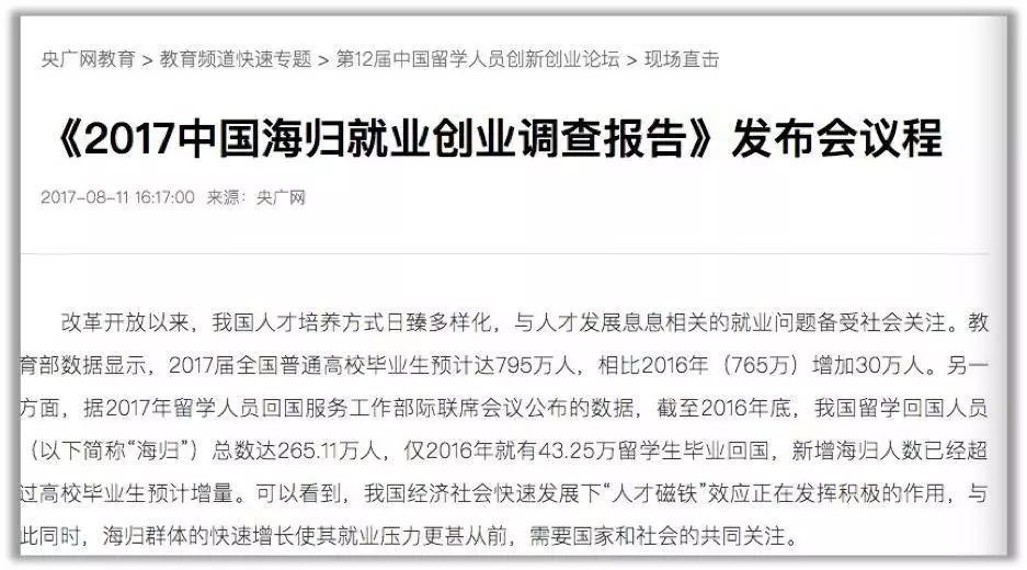根据《2017年中国留学生白皮书》的数据,73%的中国海外留学生计划完成学业后归国。而到2016年底,中国的留学回国人员总数达到了265.11万。