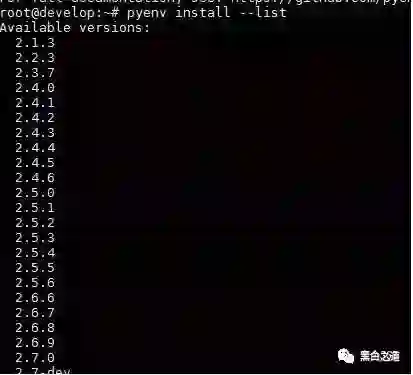 我们通过pyenv的install命令,可以查看pyenv当前支持哪些Python版本,该命令会列出可以用 pyenv 安装的 Python 版本。列表很长,仅列举其中几个,如下所示:
