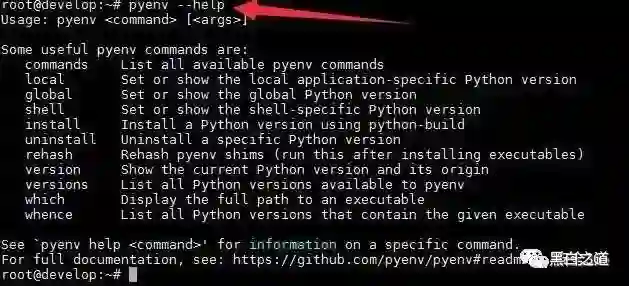 至此,pyenv就安装完成了,我们可以通果下面的命令验证pyenv是否正确安装并获取pyenv的安装信息:pyenv --help