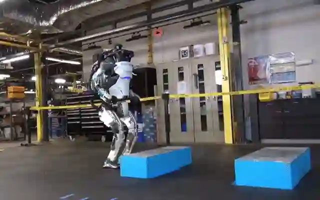 小跑着的Atlas,在不改变步伐的情况下,轻松单腿在三个高台上跳跃穿梭,跳跃高度40厘米。Atlas依靠计算机视觉来识别周围可见的标记物,给自己定位,这样就能精准地落在合适的位置。