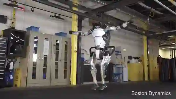对于一个巨大、沉重的机器人(之前透露的数字约160斤)来说,这是一个新的挑战。在完成跑酷跳跃时,机器人需要控制好重心和动力分配,而且需要不断改变跳跃的方向。