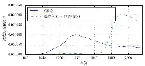 图2 根据Google图书中短语“控制论”“联结主义”或“神经网络”频率衡量的人工神经网络研究的历史浪潮(图中展示了3次浪潮的前两次,第3次最近才出现)。第1次浪潮开始于20世纪40年代到20世纪60年代的控制论,随着生物学习理论的发展(Mc Culloch and Pitts,1943;Hebb,1949)和第一个模型的实现(如感知机(Rosenblatt,1958)),能实现单个神经元的训练。第2次浪潮开始于1980—1995年间的联结主义方法,可以使用反向传播(Rumelhart et al.,1986a)训练具有一两个隐藏层的神经网络。当前第3次浪潮,也就是深度学习,大约始于2006年(Hinton et al.,2006a;Bengio et al.,2007a;Ranzato et al.,2007a),并且于2016年以图书的形式出现。另外,前两次浪潮类似地出现在书中的时间比相应的科学活动晚得多
