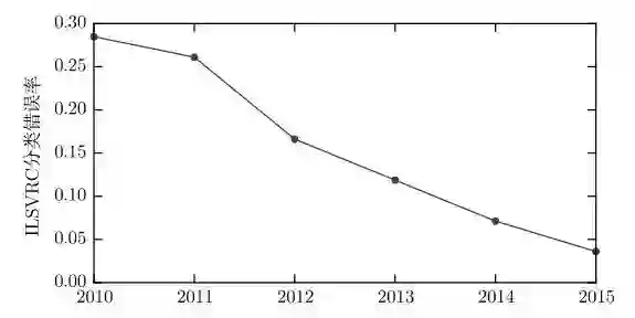 最早的深度模型被用来识别裁剪紧凑且非常小的图像中的单个对象(Rumelhart et al.,1986d)。此后,神经网络可以处理的图像尺寸逐渐增加。现代对象识别网络能处理丰富的高分辨率照片,并且不需要在被识别的对象附近进行裁剪(Krizhevsky et al.,2012b)。类似地,最早的网络只能识别两种对象(或在某些情况下,单类对象的存在与否),而这些现代网络通常能够识别至少1000个不同类别的对象。对象识别中最大的比赛是每年举行的Image Net大型视觉识别挑战(ILSVRC)。深度学习迅速崛起的激动人心的一幕是卷积网络第一次大幅赢得这一挑战,它将最高水准的前5错误率从26.1%降到15.3%(Krizhevsky et al.,2012b),这意味着该卷积网络针对每个图像的可能类别生成一个顺序列表,除了15.3%的测试样本,其他测试样本的正确类标都出现在此列表中的前5项里。此后,深度卷积网络连续地赢得这些比赛,截至写作本书时,深度学习的最新结果将这个比赛中的前5错误率降到了3.6%,如图1.12所示。