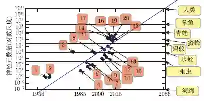 图5 与日俱增的每个神经元的连接数。最初,人工神经网络中神经元之间的连接数受限于硬件能力。而现在,神经元之间的连接数大多是出于设计考虑。一些人工神经网络中每个神经元的连接数与猫一样多,并且对于其他神经网络来说,每个神经元的连接数与较小哺乳动物(如小鼠)一样多,这种情况是非常普遍的。甚至人类大脑每个神经元的连接数也没有过高的数量。生物神经网络规模来自Wikipedia(2015)