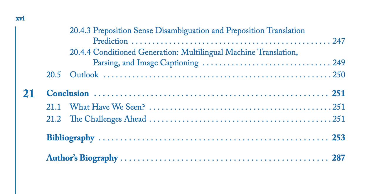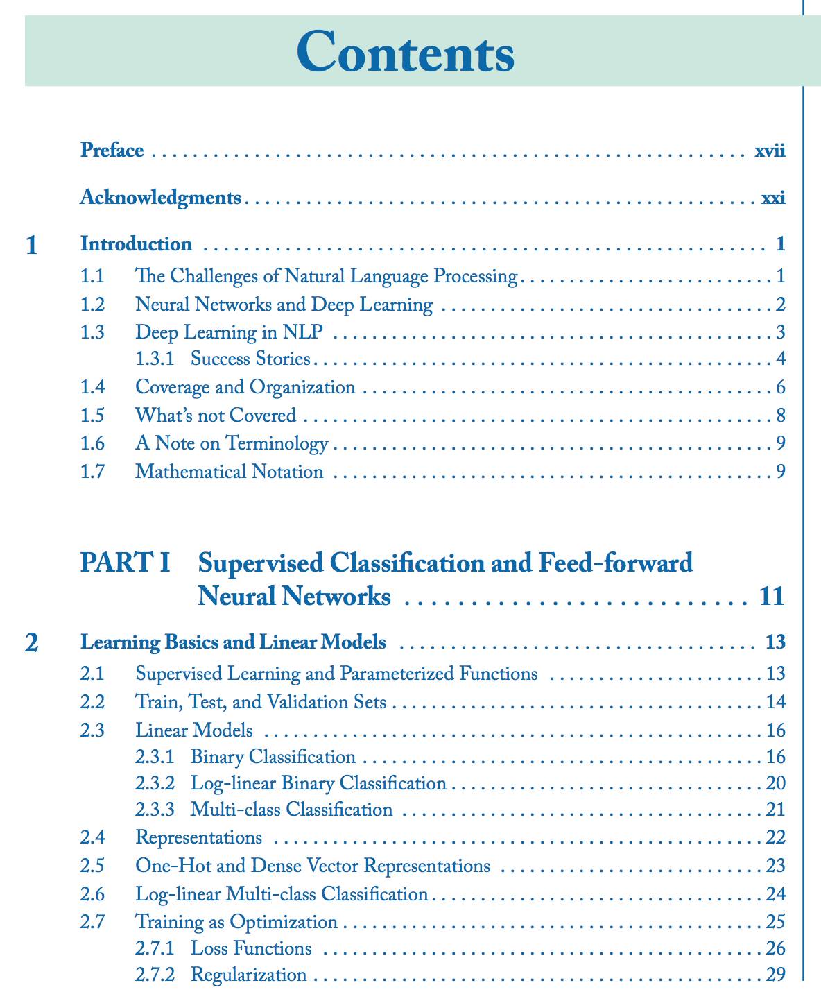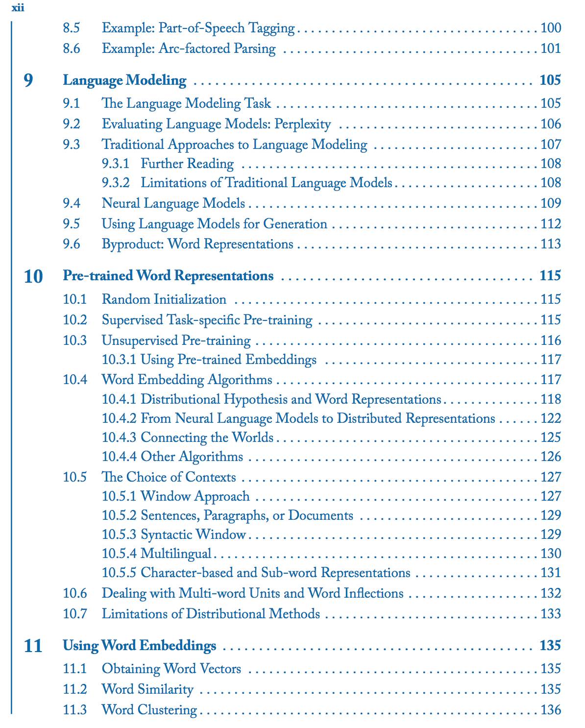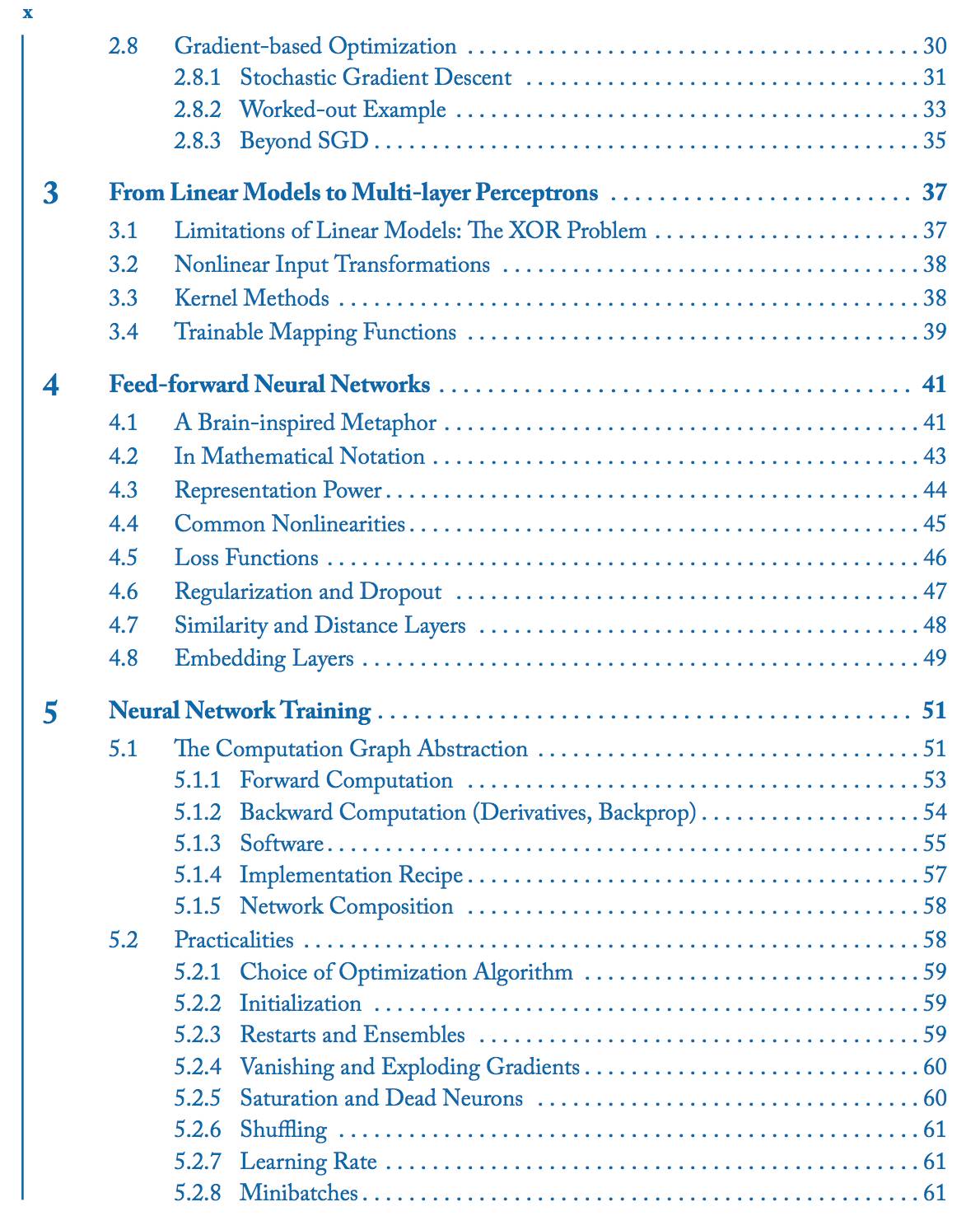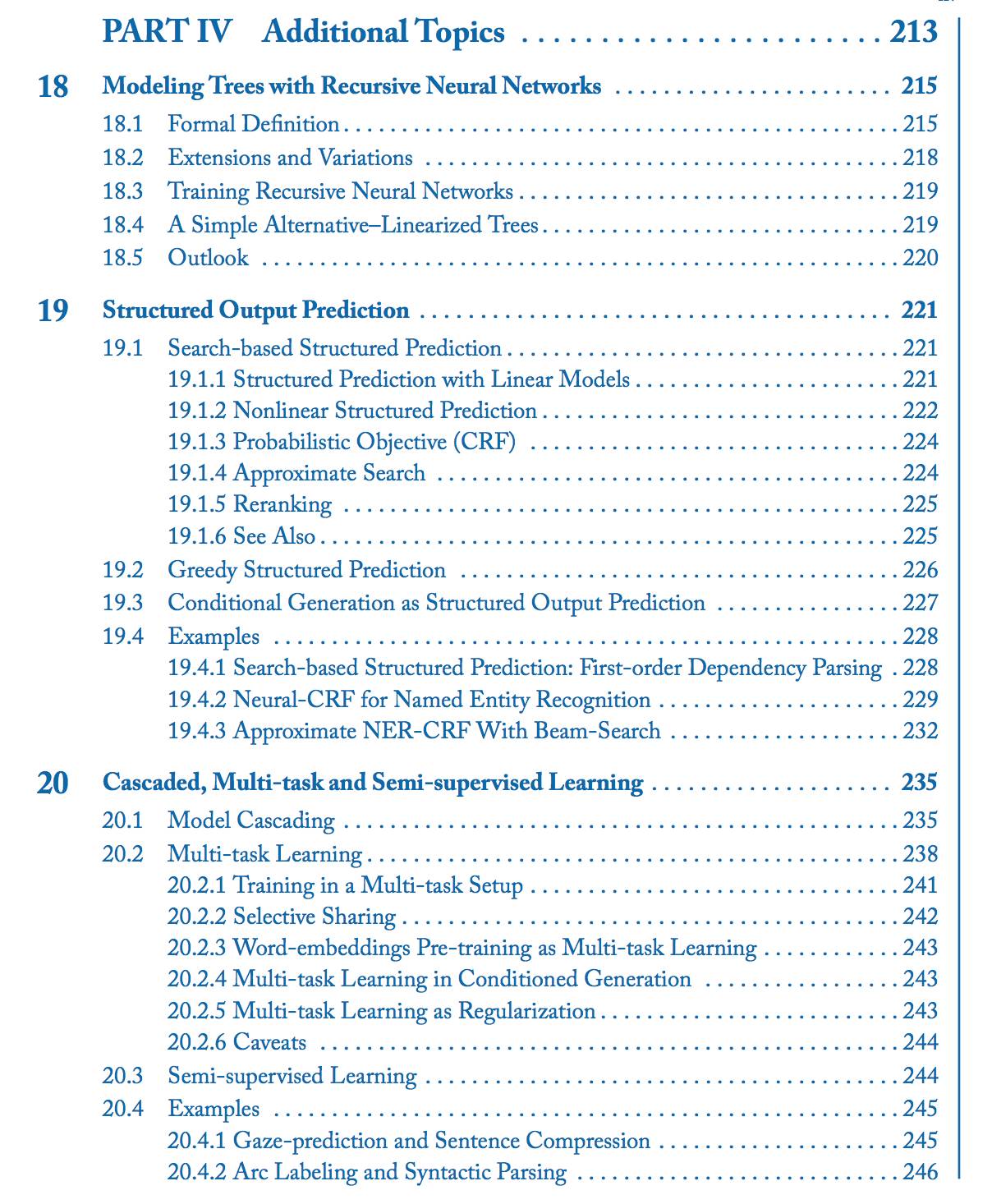 本书的后半部分(第三部分和第四部分)介绍了更多的专门的神经网络架构,包括 1D 卷积神经网络、循环神经网络、条件生成模型和注意力模型。这些架构和技术是机器翻译、句法分析和其他许多应用程序背后最先进算法的推动力。最后,我们还讨论了树形网络、结构化预测和多任务学习的前景。